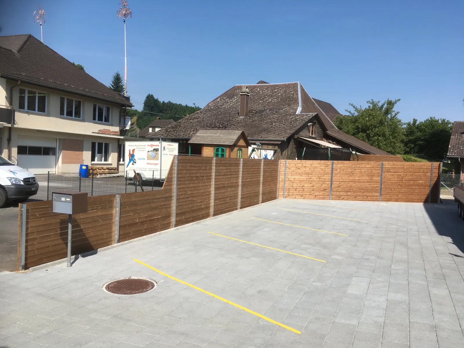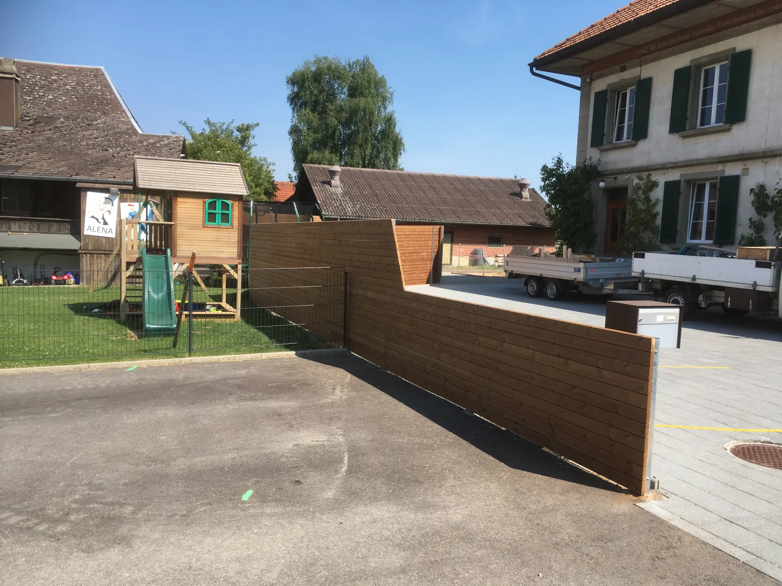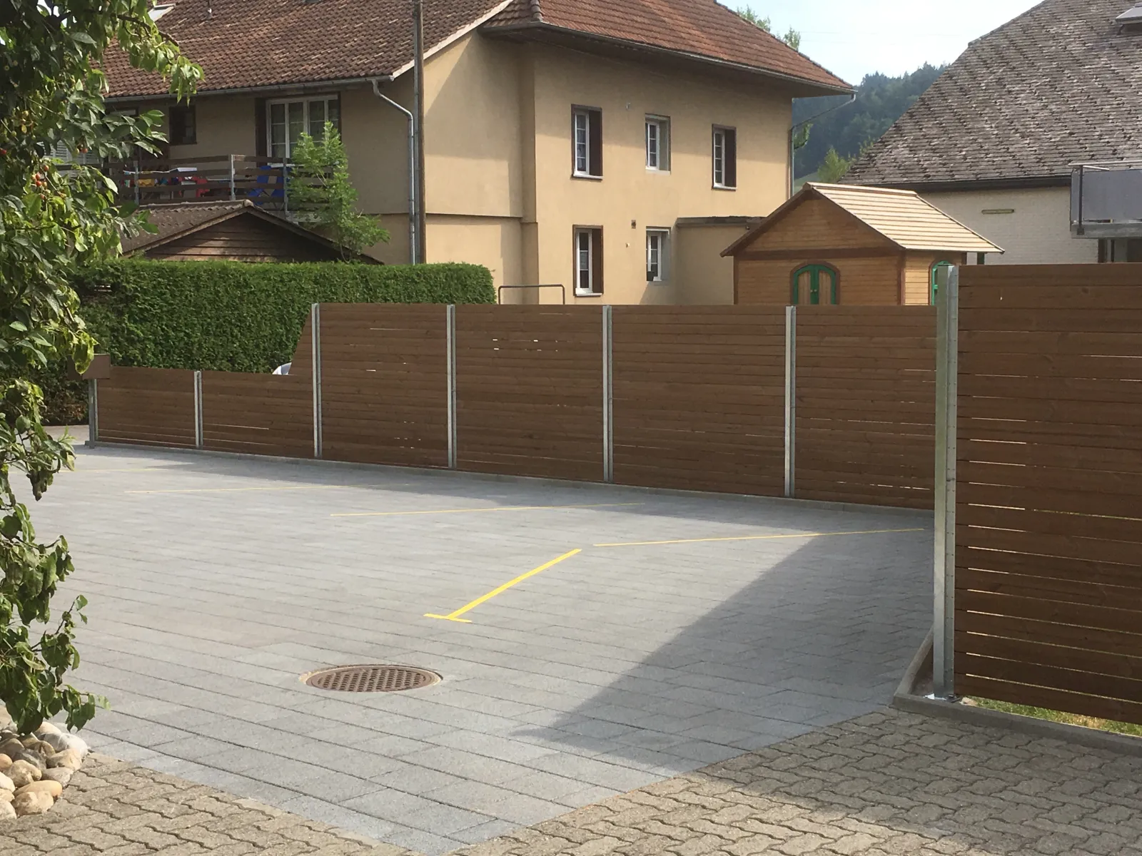 Sichtschutzwand aus Thermo behandeltem Föhrenholz, Rohmbuslatten an feuerverzinkte Profilrohre befestigt